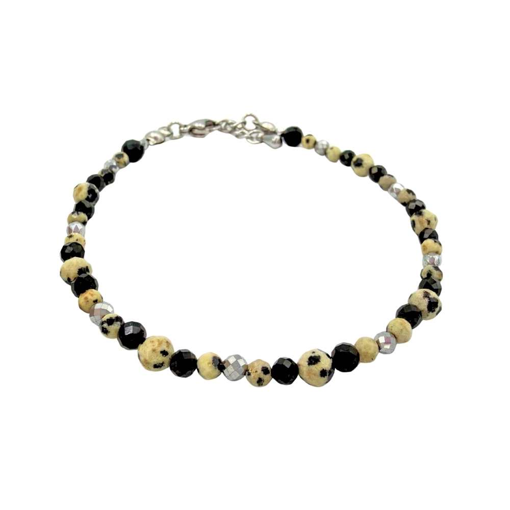 Minimalistyczna bransoletka wykonana z naturalnych kamieni, uzupełniona o eleganckie dodatki ze stali chirurgicznej. Połączenie klasycznych kolorów z trwałymi materiałami tworzy ponadczasowy dodatek, który doskonale sprawdzi się zarówno na co dzień, jak i jako subtelny element stylizacji. Ręczne wykonanie podkreśla unikalny charakter biżuterii i dbałość o detale.