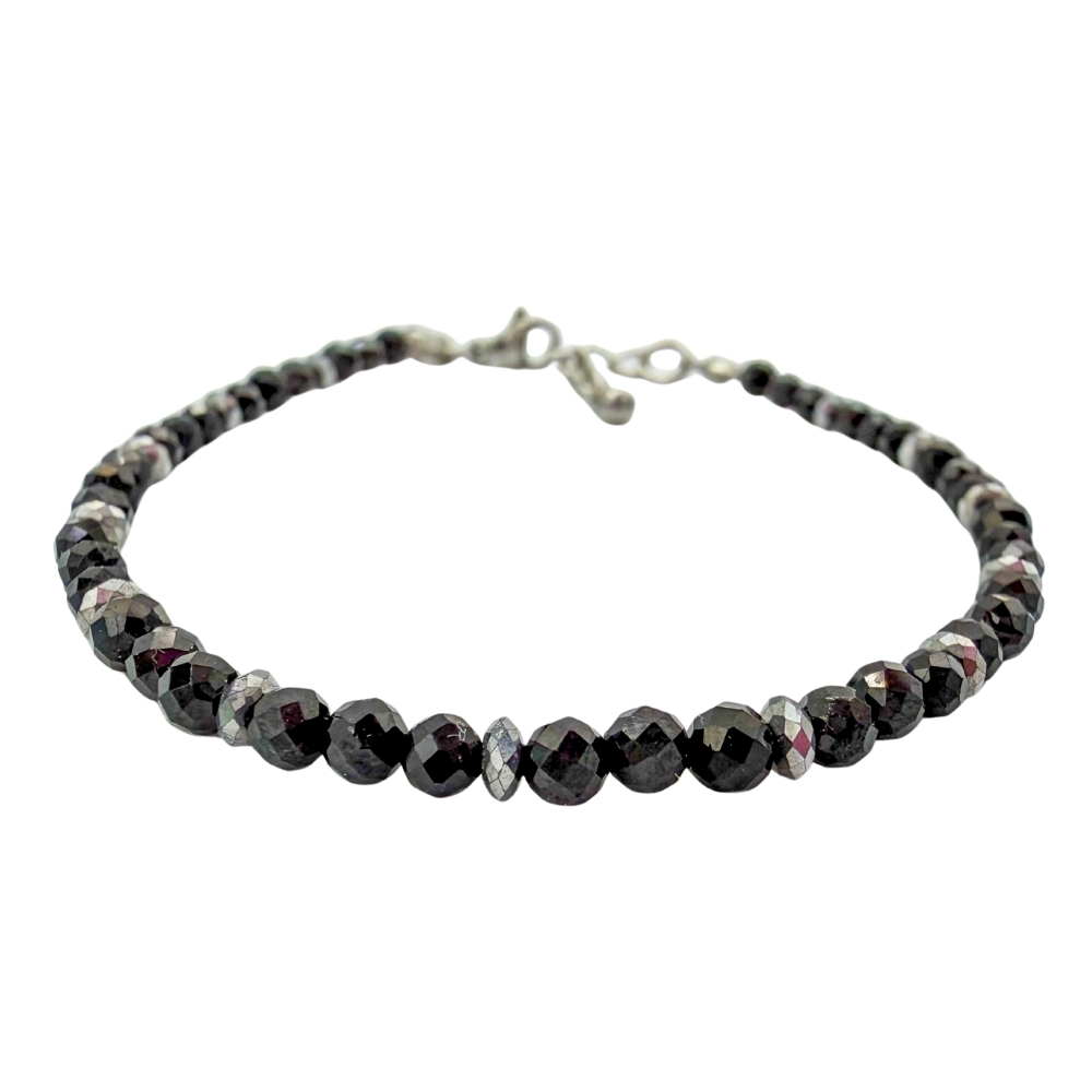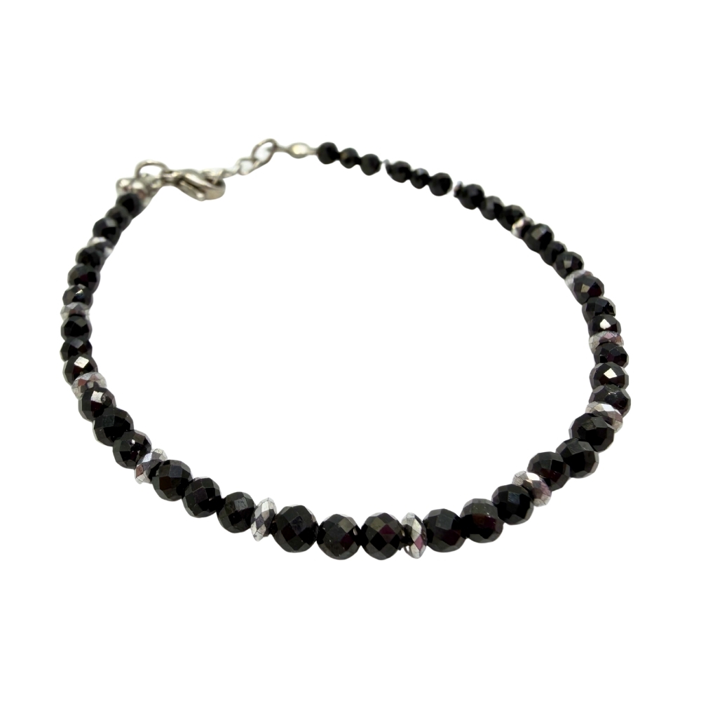 Minimalistyczna i elegancka bransoletka wykonana z naturalnego czarnego turmalinu, uzupełniona subtelnymi dodatkami ze stali chirurgicznej w kolorze srebrnym. Głęboka, intensywna czerń kamieni w połączeniu z chłodnym połyskiem srebra tworzy ponadczasową i uniwersalną biżuterię.