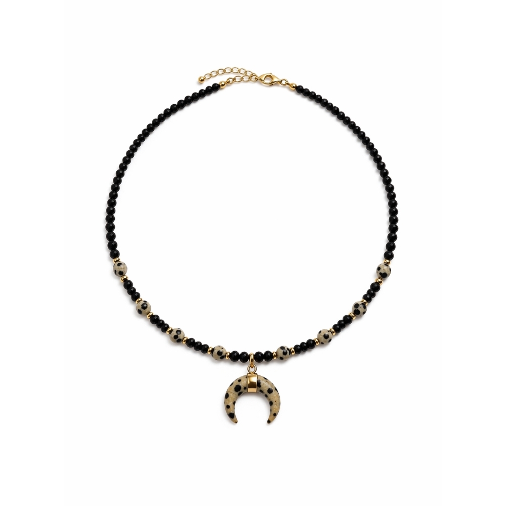 Ręcznie wykonany naszyjnik z naturalnych kamieni, który łączy elegancję z symboliką ochrony i równowagi. Minimalistyczna forma z czarnych koralików została uzupełniona charakterystyczną zawieszką oraz złotymi detalami, nadającymi całości wyjątkowego stylu. To biżuteria idealna dla osób poszukujących nie tylko estetycznego dodatku, ale także energetycznego wsparcia na co dzień.