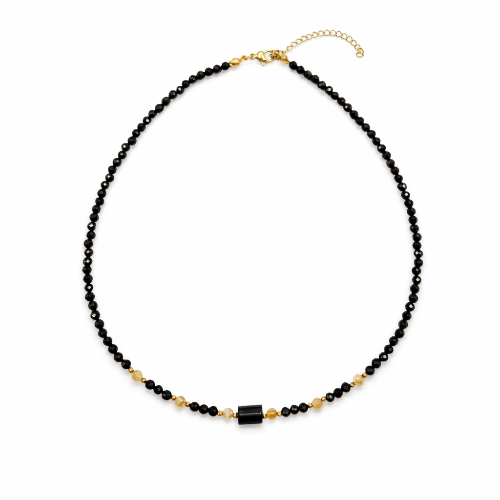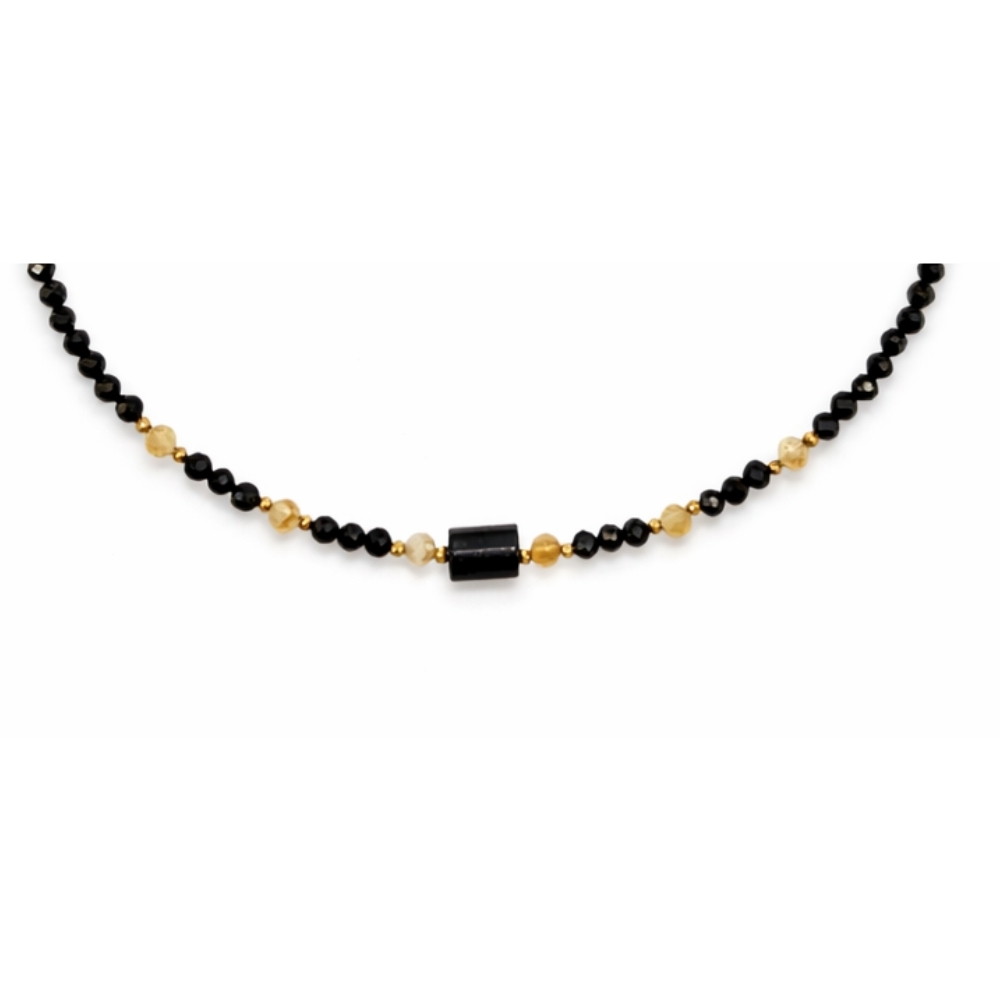 Elegancki naszyjnik wykonany z naturalnego czarnego turmalinu i cytrynu, uzupełniony subtelnymi złotymi dodatkami ze stali chirurgicznej. Kontrast głębokiej czerni z ciepłymi, złocistymi odcieniami cytrynu tworzy nowoczesną i ponadczasową kompozycję, idealną zarówno na co dzień, jak i na wyjątkowe okazje.